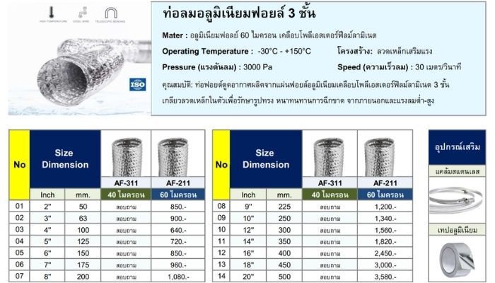 | 3 นิ้ว (75 มม.) | 10 เมตร | ระบบระบายอากาศทั่วไปในอาคาร, การลำเลียงอากาศเย็นหรือร้อน, การดูดควันในห้องครัว |